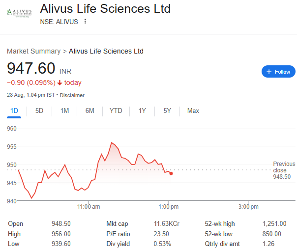 Current Alivus share price is ₹947, 52-week range: ₹1,335 – ₹827.10.