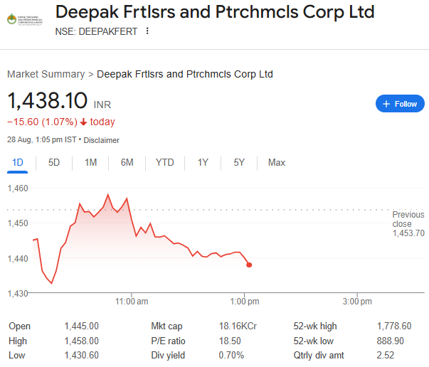 Current Deepak Fertilisers share price is ₹1,451.45 (down 3.5%). గత 2 సంవత్సరాల్లో 160% multibagger returns ఇచ్చింది, గత నెలలో 33% rally చేసింది.